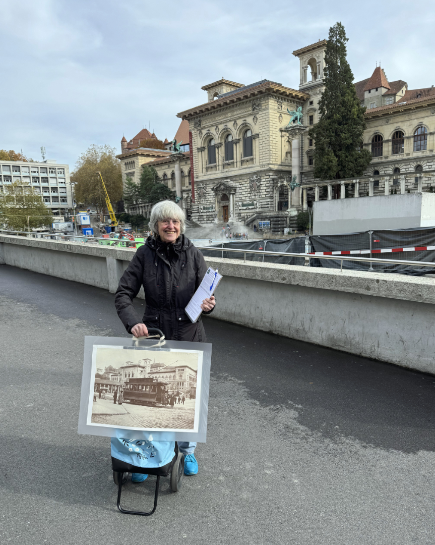 La recette de son succès: une affiche de la Riponne, vers 1903, avec le tramway des TL au premier plan devant la fameuse Grenette et le Palais de Rumine tout neuf. Trouvé par hasard chez elle récemment, le poster est attaché sur son chariot à commissions qu’elle promène de l’avenue d’Echallens jusqu’à la Riponne. Les passants sont conquis par son enthousiasme et sa passion pour le projet.